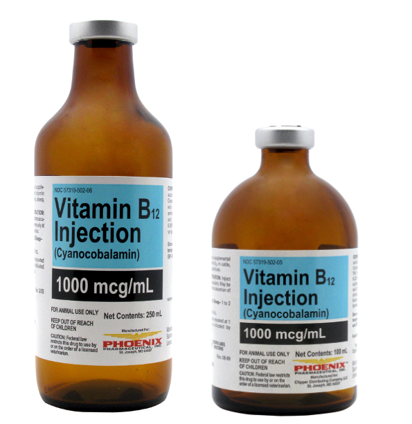 For use as an aid in the management of Vitamin B12 deficiencies in cattle, horses, sheep, swine, dogs and cats.