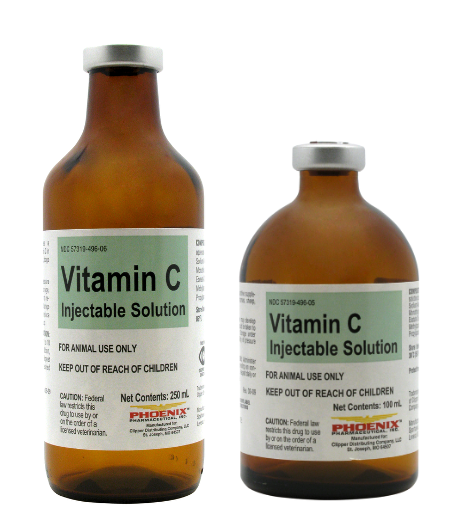 For use as a nutritive supplement of Vitamin C in cattle, horses, sheep, swine, dogs and cats.